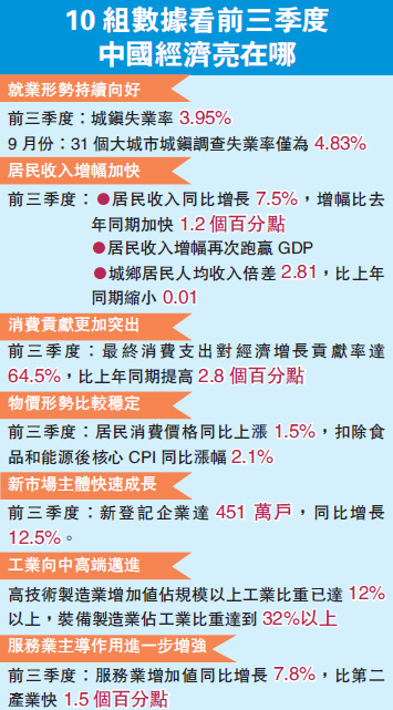 10月中旬,中國央行行長周小川出席國際貨幣基金組織/世界銀行年會期間表示,今年以來中國經濟增長動能有所回升,下半年有望實現7%的增長。此后公布的中國前三季度GDP數據顯示,中國的GDP同比增長6.9%,增速與上半年持平。周小川的表態和中國經濟的實際表現,讓不少專家已經確定,下半年中國經濟不會出現較大調整,全年GDP將保持6.8%-7%的增速,并且將進入平穩軌道。專家表示,中國經濟的增長對於周邊國家來說意味著更多的發展機會,對於世界經濟來說則意味著更加穩定的未來。中國可借此機會提升參與全球經濟治理的能力。香港商報記者 伍敬斌