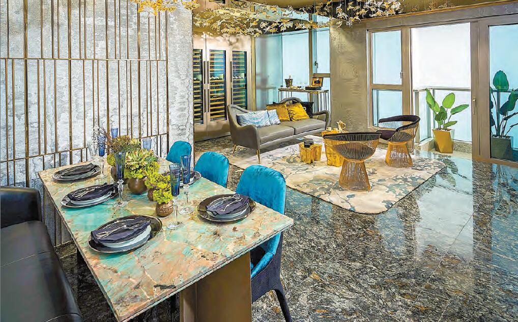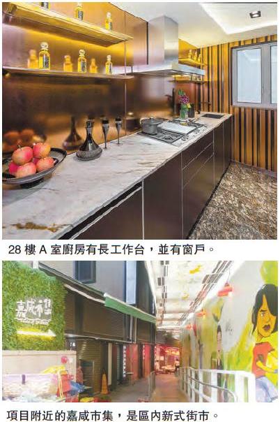 發展商在中環中心62樓設置售樓處,并搭建經改動的連裝修示範單位。示範戶以28樓A室為藍本,實用面積996平方尺,三房連一套房加連廁儲物房間隔。甫進大門為玄關,旁為長方形獨立廚房,內有雙邊工作台,配備德國Gaggenau電子燒烤爐、蒸焗爐、煤氣煮食爐、保溫抽屜及嵌入式咖啡機等,廚櫃同屬德國品牌Bulthaup,以古銅色金屬飾面廚櫃門及大理石作為廚櫃台面。長方形大廳布局分明,飯廳以巴西Ice Sea Blue大理石餐桌配特色壓紋真皮梳化及餐椅,恍如將中區的Fine Dining品味生活帶回家。