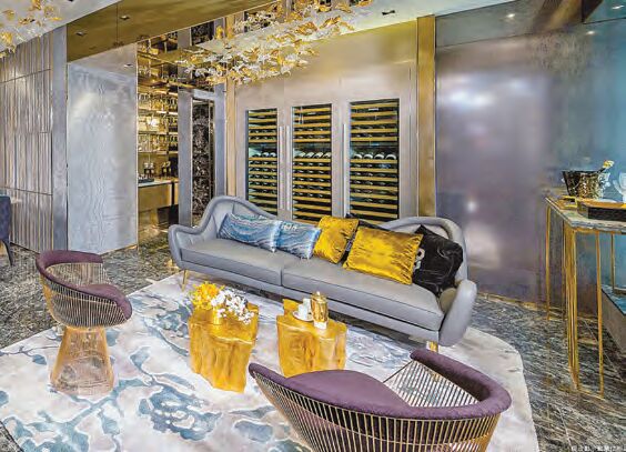 設計師將大廳與毗鄰的房間打通,形成特大廳區,廳區放了長梳化、兩張獨立18K金座椅,以及兩個茶几,大廳外連36平方尺露台,增加采光,同時令室內更通爽。原睡房位置現設計成品酒空間,設有美國SUB-ZERO酒窖及Bulthaup酒櫃等,盡顯生活品味。睡房及浴室位於走廊兩旁,細睡房牆身以灰色大理石打造,配襯深色木地板,流露成熟韻味。主人套房位於走廊盡頭,房間面積寬敞,大床置中后可三邊落床,睡房的特色牆由意大利真皮制成,配襯銀鏡及香檳金色水晶吊燈,以及手工木紋屏花開放式衣櫃,用料講究。主人房并外連16平方尺工作平台,增添大宅風範。