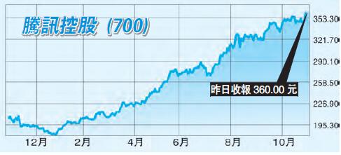 除保險股升勢凌厲之外,「股王」騰訊(700)亦帶動恒指上升,騰訊收報360元,再創上市新高,成交78.4億元。騰訊作為大股東的騰訊音樂娛樂已邀請投行開始IPO工作,集資至少10億美元,目前傾向香港或紐約上市。