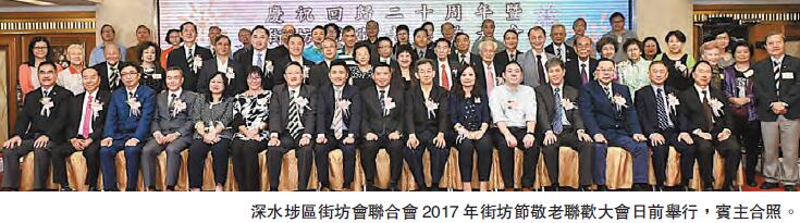 【香港商報网訊】深水桋區街坊會聯合會慶祝回歸二十周年暨2017年街坊節敬老聯歡大會日前假旺角倫敦大酒樓舉行,大會筵開70席,一眾街坊會首長區內友好歡聚一堂,場面熱鬧。中聯辦九龍工作部副部長劉國強、深水桋民政事務專員李國雄、深水桋區議會主席張永森、深水桋警區指揮官曹明龍總警司、廉政公署西九龍辦事處首席廉政教育主任嚴厚蘊、社署深水桋區福利專員鄒鳳梅、食環署深水桋區環境衛生總督察黃立人、康文署深水桋區康樂事務經理李淑玲、懲教署荔枝角收押所懲教事務總監督梁仲池等蒞臨主禮,大會主席、深水桋街坊福利會副監事長吳振雄及大會籌委會主席梁鉅海等陪同。
