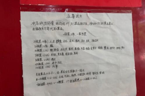 该店员说,这张温馨提示也是今天才贴上去的。 “他们来查说要整改,我们就按照要求做了。”面对“一菜多签”的情况,这名女店员认为,自己觉得应该这样卖。“你觉得接受得了你就吃,贵了不吃也可以,我们也不是强制顾客消费。有的串串店的签子虽然少,但是也要5角一根,我们签子多点,只要2角钱一根。”
