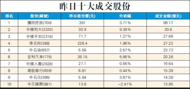 騰訊昨收市再寫下歷史新高的391元,上升3.71%,貢獻恒指逾百點升幅,市值亦突破3.7萬億元;分析認為,若股價升上420元,持貨者可考慮先行獲利,然後再伺機買入。石油及內險亦走強,刺激港股最多升420點。吉利汽車(175)則領漲於藍籌,全日漲逾半成,報26.15元;獲卡塔爾航空入股的國泰(293)則逆市倒跌2.46%,報12.68元,為全日最差藍籌股。
