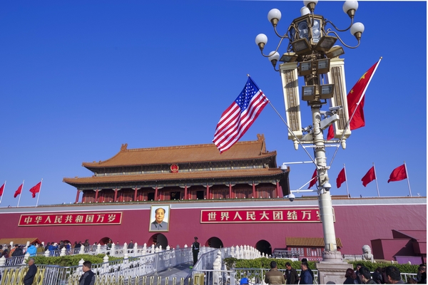 11月8日,北京天安门前悬挂起中美两国国旗。中新社