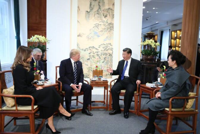 习近平和夫人彭丽媛同特朗普夫妇在宝蕴楼茶叙