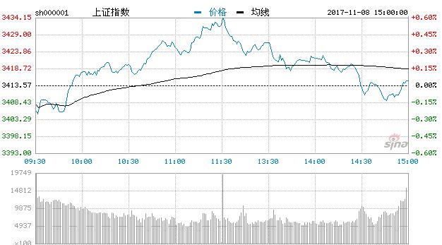 據新浪財經,早盤三大股指全線低開,上午,滬指小幅高開後在360概念股、共享單車、白酒等板塊帶動下呈現沖高態勢,而後在傳媒、券商等板塊的影響下,滬指持續發力並最終成功越過3430點,牢牢站穩3400點。午後,隨著券商、銀行板塊個股紛紛回落,加之藍籌白馬股的殺跌,滬深兩市略顯走弱。雖然兩市股指繼續紅盤運行,但走勢有所分化,滬指回落漲幅收窄,深成指則維持震蕩格局。創指午後盤中走強,漲幅擴大至逾1%,一度站上1880點。臨近尾盤,隨著藍籌白馬股持續殺跌,兩市盤中一度回落翻綠。截止發稿,滬指報3415.46,漲0.06%;深成指報11447.40,跌0.18%;創指報1866.14,漲0.38%。