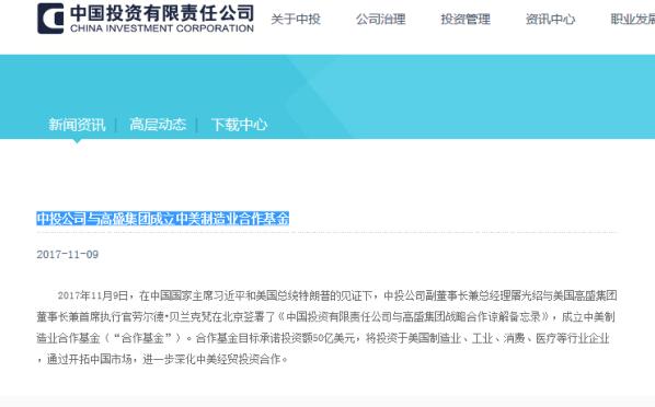 据中国投资有限责任公司官网消息,9日,在国家主席习近平和美国总统特朗普的见证下,中投公司副董事长兼总经理屠光绍与美国高盛集团董事长兼首席执行官劳尔德·贝兰克梵在北京签署了《中国投资有限责任公司与高盛集团战略合作谅解备忘录》,成立中美制造业合作基金(“合作基金”)。合作基金目标承诺投资额50亿美元,将投资于美国制造业、工业、消费、医疗等行业企业,通过开拓中国市场,进一步深化中美经贸投资合作。
