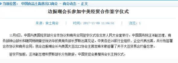 另据中国食品土畜进出口商会官网消息,8日中国食品土畜进出口商会会长边振瑚与美国大豆出口协会主席吉姆米勒签署了关于大豆贸易合约备忘录。中国国务院汪洋副总理、商务部钟山部长和随同特朗普总统访华的美商务部长罗斯共同见证。