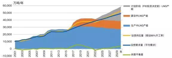 (图1 ,未来几年全球LNG产能供需平衡趋势图,数据来源世界LNG进口国协会)