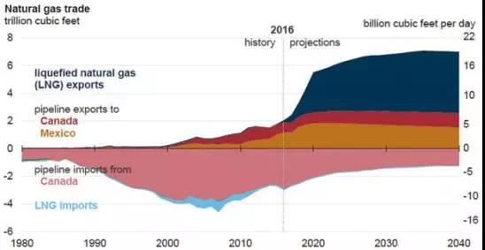 在2017年美国能源信息局(EIA)发布的“年度能源展望2017”中,由于对墨西哥管道出口天然气的开始(见图5),2020年美国将成为天然气净出口国(见图3)。预计到2020年北美(美国和加拿大)会建成6大LNG出口基地(见图4),产能将达到7000万吨/年。