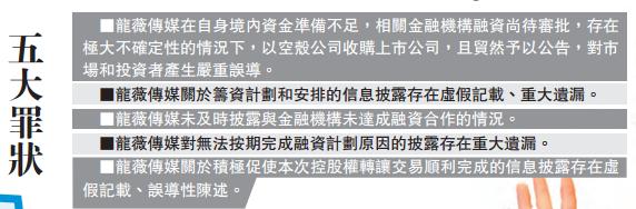 據中證監的告知書,龍薇傳媒在自身境內資金準備不足,相關金融機構融資尚待審批,存在極大不確定性的情況下,以空殼公司收購上市公司,且貿然予以公告,對市場和投資者產生嚴重誤導。