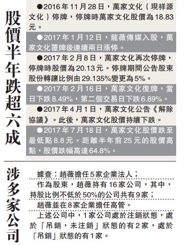 公告顯示,中證監擬決定:對萬家文化責令改正,給予警告,並處60萬元罰款;對孔德永給予警告,並處30萬元罰款;對龍薇傳媒責令改正,給予警告,並處60萬元罰款;對黃有龍、趙薇、趙政給予警告,並分別處以30萬元罰款;對孔德永、黃有龍、趙薇分別採取5年證券市場禁入措施。