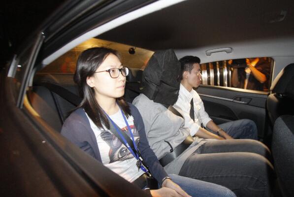 女疑犯被黑布蒙頭押返警署扣查。