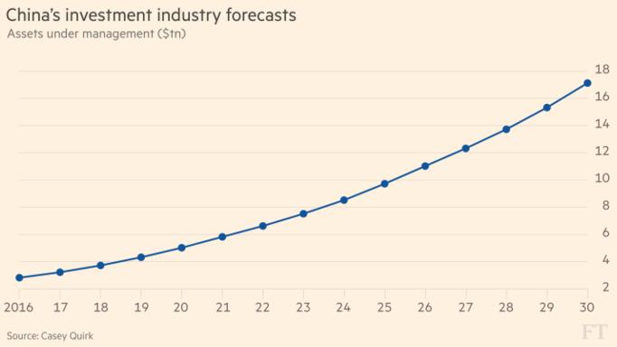 咨詢公司Casey Quick預測,其結果是,中國投資行業的管理資產將從去年底的2.8萬億美元左右,增至2030年的17萬億美元左右。