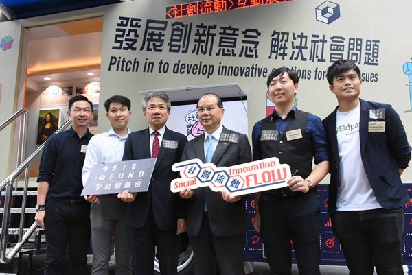 張建宗(右三)與張仁良(左三)昨主持社創基金互動展覽車開展禮。記者馮瀚文攝