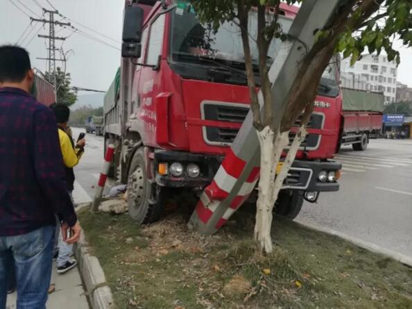 由于车速较快,大货车右前轮将电动车连车带人卷入车底,直到冲上绿化带,并撞到信号灯柱被卡住才停下来。