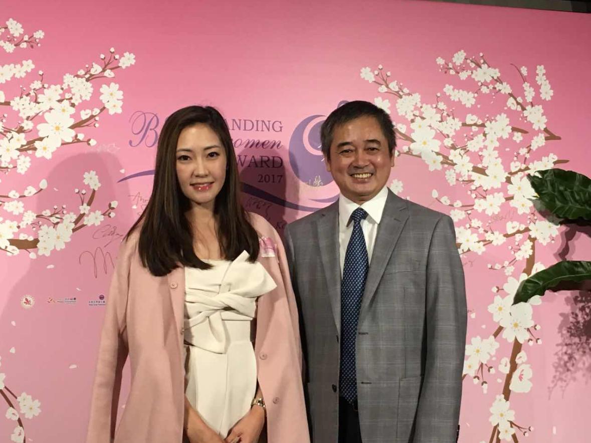 殷商王朝乙丙丁健康產業董事長宋筠瑄(右)從香港商報社長陳寅先生(左)手上接過奬項。