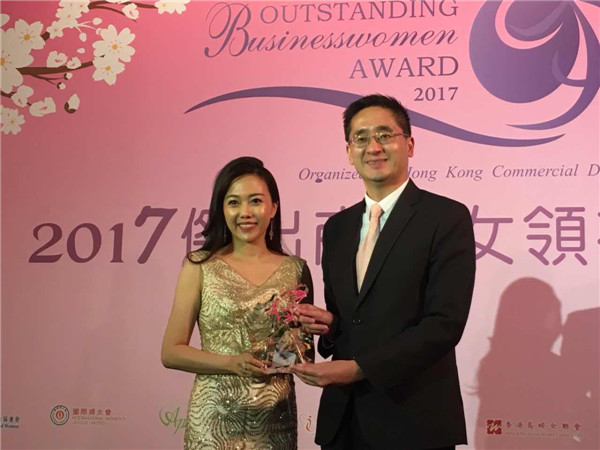 利豐發展(中國)董事兼集團華東首席代表趙麗娟從香港中聯辦副主任仇鴻女士手中接過《卓越商界女領袖大獎》。