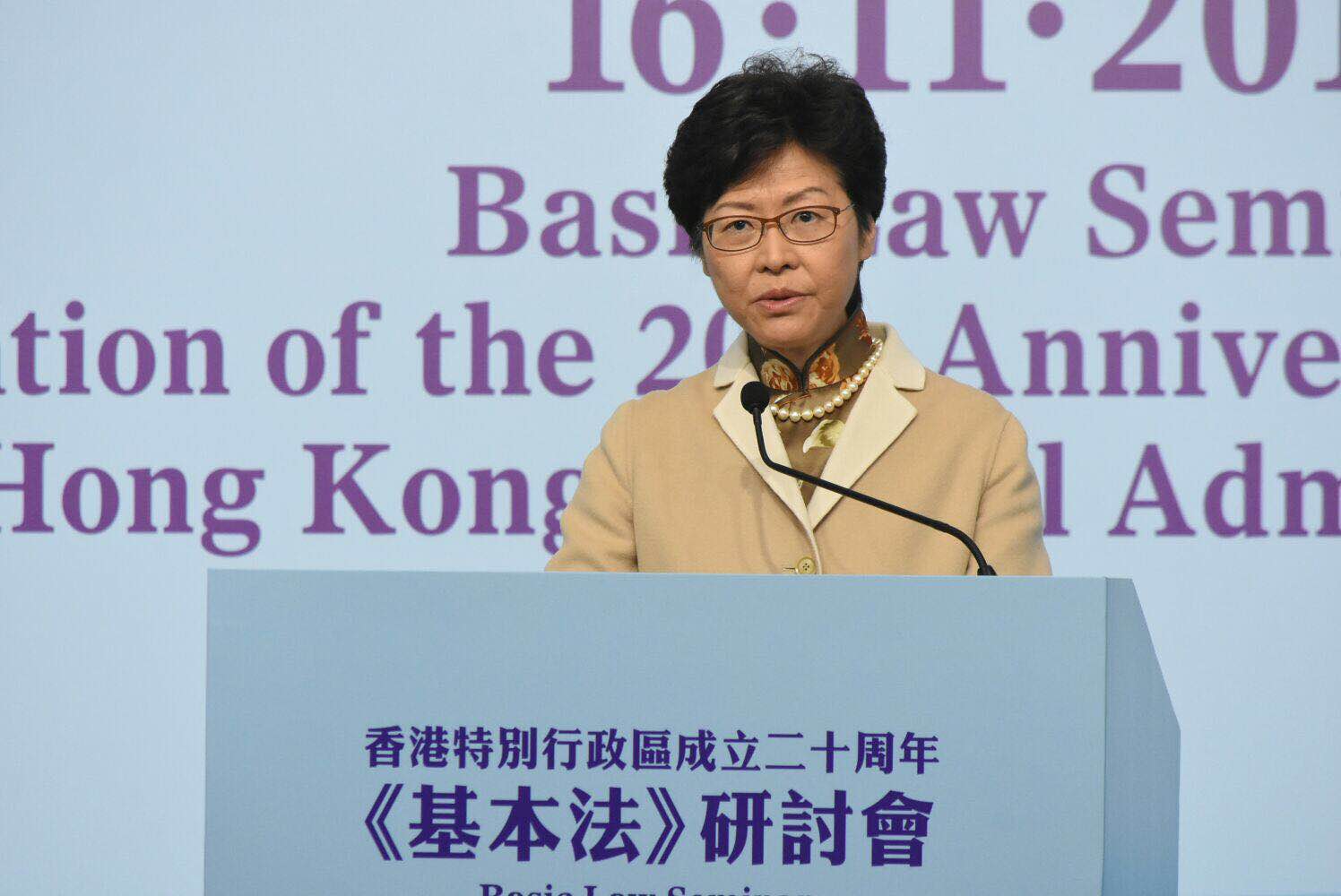 林鄭月娥說,近年香港社會出現少部分人抗拒一國,實在令人痛心。