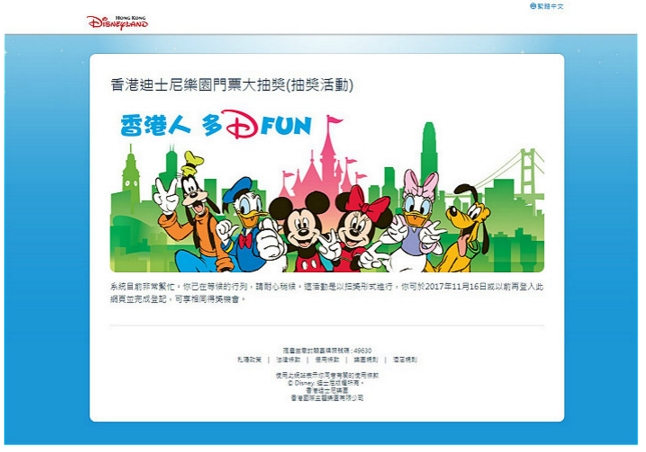 【香港商报网讯】香港迪士尼樂園推出港人優惠,送出5萬張門票抽獎,抽獎活動首日推出頭四小時已有逾30萬人登記,截至11月12日已有逾90萬人登記,反應熱烈,登記日期今日截止,而抽獎活動結果將於本月22日公布。