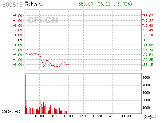 11月17日消息,昨日茅台公布風險提示,而高盛給出881元目標價,而今日盤中股價大跌超5%,截止發稿,貴州茅台跌5.02%,報694.68元。