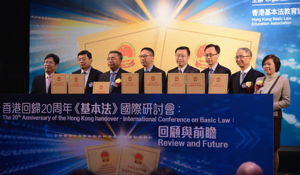 香港回歸20周年《基本法》國際研討會主禮嘉賓與講者合照。左起:鄒平學、王振民、楊義瑞、袁國強、何靖、聶德權、饒戈平及梁美芬。記者崔俊良攝