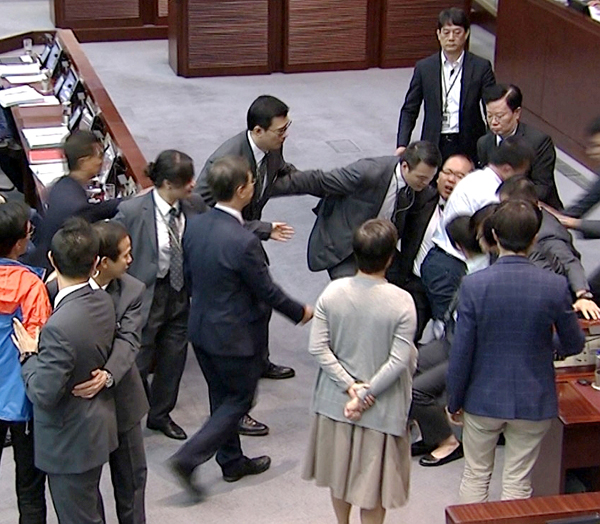 會議進行了近2小后才進入有關修改《議事規則》的議程,議事規則委員會主席謝偉俊宣讀報告時,人民力量陳志全企圖阻止對方發言,并意圖搶走文件,但遭謝推開,場面混亂,會議一度暫停,保安介入調停,築起人鏈,阻止議員冲向主席台,期間一名保安人員報稱倒地受傷,有救護員到場查看該名保安人員傷勢,他事后自行到醫院接受治療。立法會秘書處事后稱,受傷的保安人員是肌肉扭傷,已經回家休息。