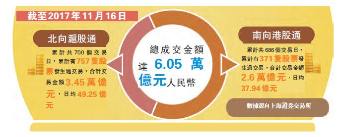 截至2017年11月16日,北向滬股通累計共700個交易日,累計有757隻股票發生過交易,合計交易金額3.45萬億元,日均49.25億元;南向港股通累計共686個交易日,累計有371隻股票發生過交易,合計交易金額2.6萬億元,日均37.94億元。