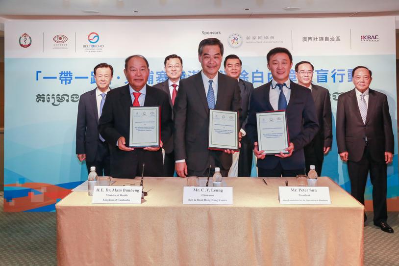 梁振英(前中)與柬埔寨衛生部長曼本亨(前左一)及亞洲防盲基金會會長孫國華(前右一),為推出「一帶一路消除白內障致盲行動」簽署合作備忘協議。