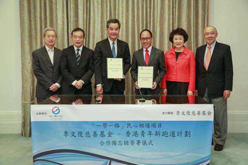 梁振英(左三)與企業家李文俊(右三)簽署香港青年新跑道計劃合作備忘錄,其他中心董事劉炳章(左一)、張志剛(左二)、鄧爾邦(右一)、高靜芝(右二)一同見證。