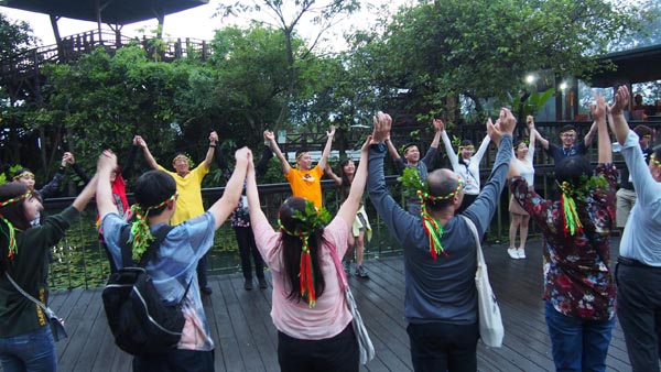 大家載歌載舞學習跳阿美族原住民舞蹈。