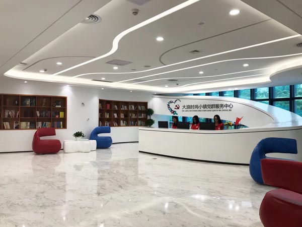 线条流畅的弧形接待服务台、用纽扣织成的党徽、清新雅致的桌椅、“design”形状的宣传栏、造型个性的沙发、鲜明的主题····时尚小镇党群服务中心“靓丽”形象让人眼前一亮,“很时尚,很宽敞”,当日,现场参加“龙华区时尚设计师提升发展之道”培训的设计师小黄大为赞叹。