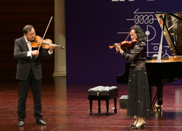 夫妻选手在进行小提琴比赛中。