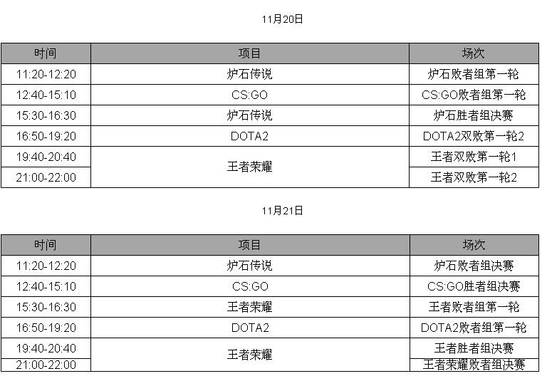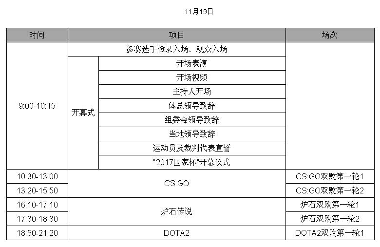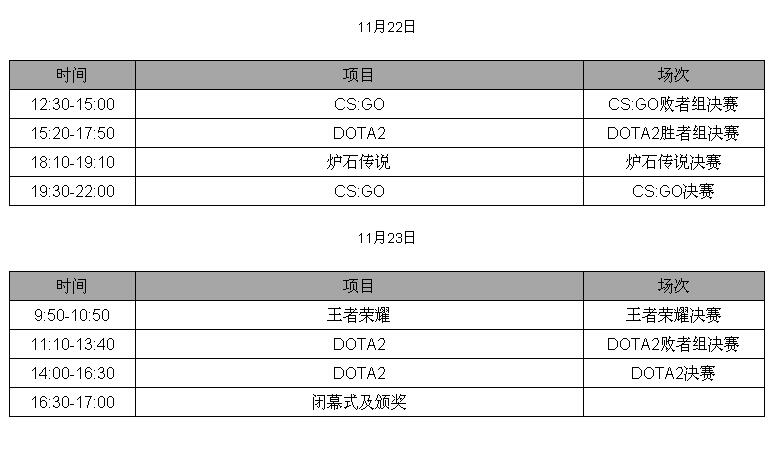 本次国家杯电子竞技大赛全球总决赛赛程为11月19日-11月23日,共计5天,每日安排如下: