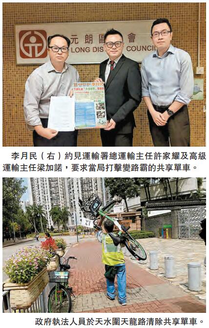 元朗區議員李月民表示,曾就本區共享單車亂泊情況向政府反映,建議制訂有法律約束的營運守則;檢討及優化滯後的「土地(雜項條文)條例」及「簡易治罪條例」等,即時有效規管單車違泊阻街霸路。9月23日,政府多個部門聯合執法沒收23輛(其中,17輛共享單車)違泊超過48小時(地政條例)的單車,而他亦於10月3日區議會遞交有關單車議程,同時,就共享單車投放量驟增及違泊與Gobee.bike、Ketch'UpBike、Hobabike及oBike公司的負責人會晤反映情況。