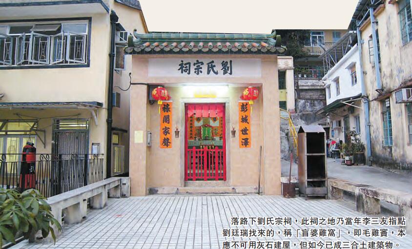 劉廷瑞是個傳奇人物,他文武雙全,原是個千總(按:約今中尉軍階),因得罪權貴,迫得攜母南來避難。初時他住在阿公角,相傳「阿公角」這名稱就是因他而來;之後因得堪輿大師李三友賞識,指點他搬到隔海的落路下住,並在一處「盲婆雞窩」風水地築了一間禾稈草祠堂,獲得地靈護蔭,日後終風生水起、百子千孫。