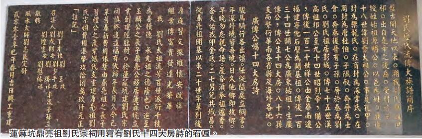 這一首「身份詩」,筆者是在蓮麻坑鼎亮祖劉氏宗祠的石匾看到的,之後又在馬尾下簡頭村和吉澳劉氏的族譜首頁讀到,可見此詩在廣東劉氏客家族群中確實廣泛流傳,卻未知是否曾有人應用。