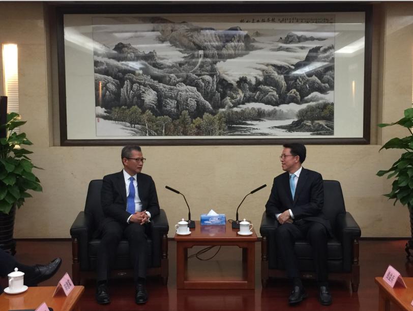 陳茂波(左)昨日下午拜會國務院港澳辦主任張曉明(右)。