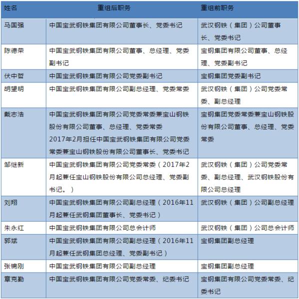 原武钢集团董事长、党组书记马国强出任新成立的宝武钢铁集团董事长、党组书记,原宝钢集团总经理、党委副书记陈德荣出任宝武钢铁集团总经理、党委副书记。