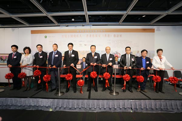 「首屆全國殘疾人書畫藝術家(香港)邀請展」昨日開幕,賓主為書畫展剪綵。