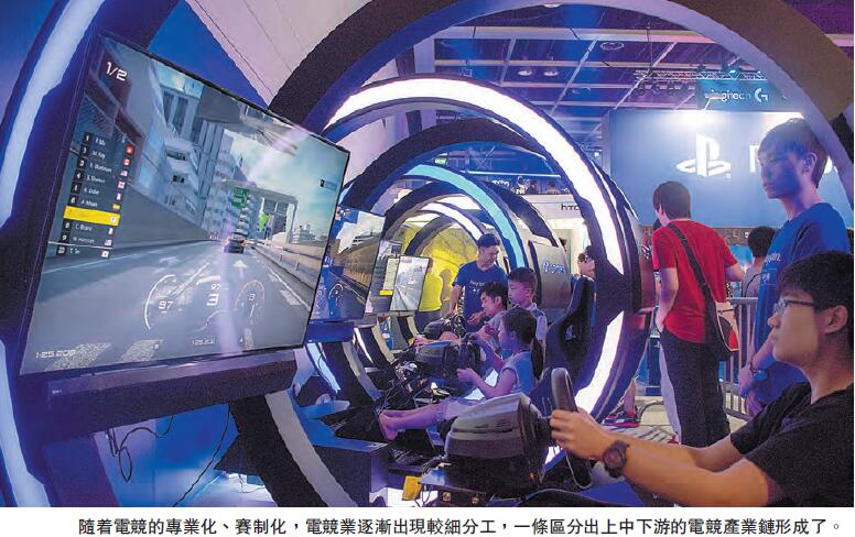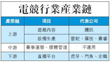 随着电竞的专业化、赛制化,电竞业逐渐出现较细分工,一条区分出上中下游的电竞产业链形成了。大体来说,电竞产业链主要由上游的内容生产、电子竞技设备生产,中游的赛事运营、媒体管道,以及下游的直播平台、对战平台等组成。
