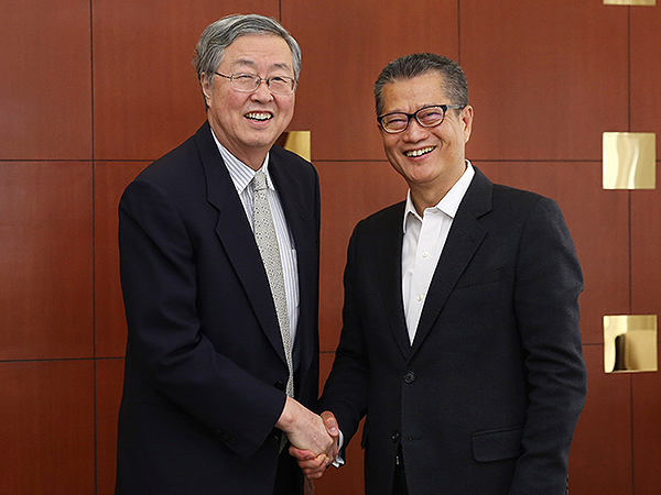 財政司司長陳茂波(右)11月21日繼續訪京行程,與中國人民銀行行長周小川會面。