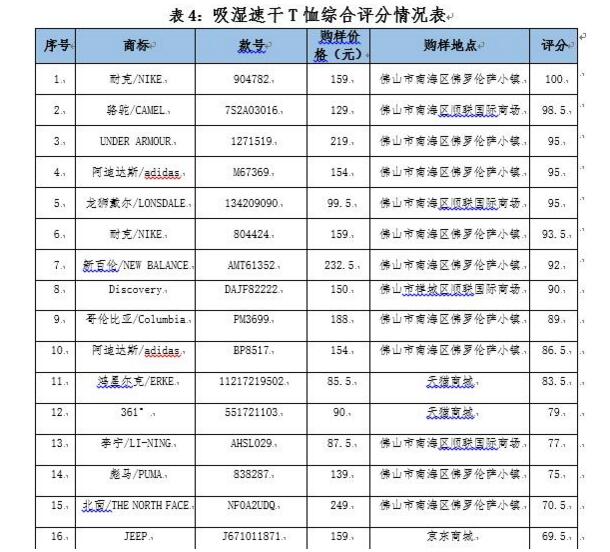 比较试验样品由佛山市消委会工作人员以普通消费者身份在佛山市部分商场、专卖店以及网上平台随机购买,共30款,其中冲锋衣10款,购样价格从399元至1349元不等;吸湿速干T恤20款,购样价格从85.5元至249元不等。基本涵盖了消费者熟知的国内外知名品牌以及大众消费主流品牌。包括“Columbia(哥伦比亚)”、“NIKE(耐克)”、“adidas(阿迪达斯)”、“KAILAS(凯乐石)”、“李宁/LINING”、“361度”、“鸿星尔克/ERKE”等25个品牌。