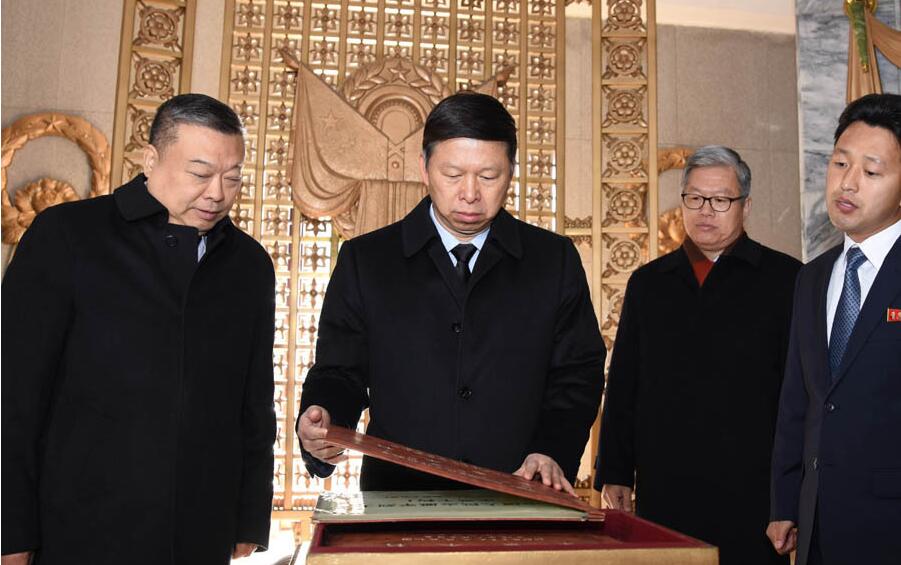 随后,代表团一行专程赶赴100公里以外的平安南道桧仓郡志愿军烈士陵园祭扫,毛岸英等134名烈士安眠在那里。2012年重新修缮完工的墓园庄严肃穆,墓群前的广场上,青松翠柏映衬着一尊气势雄伟的志愿军勇士青铜塑像,中式碑楼内矗立着一座汉白玉英雄纪念碑。
