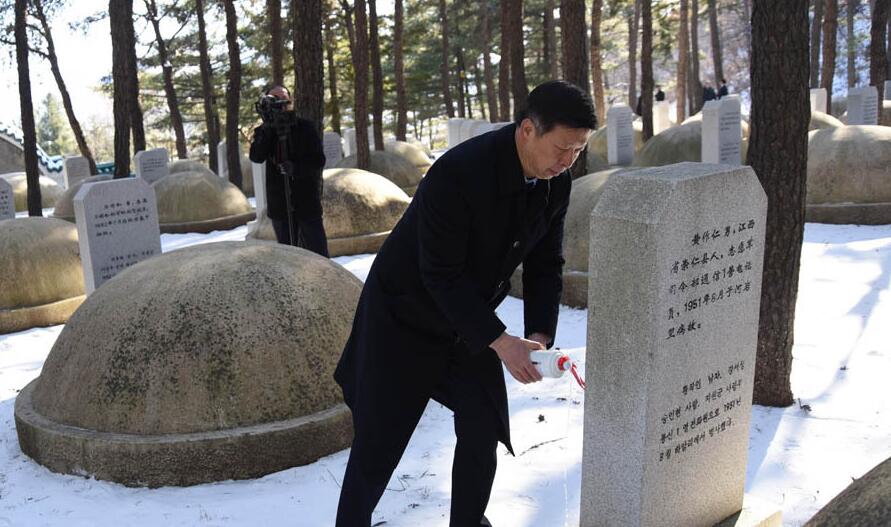 宋涛一行向纪念碑敬献花篮并默哀致敬,然后拾阶而上,步入墓园。皑皑白雪和苍翠松柏陪伴下,上百座烈士墓朴素排满了整个山坡。宋涛踏着白雪逐一走到烈士墓前,躬身捧酒祭奠。清冽的空气中顿时飘散着来自故乡的酒香,寄托着祖国亲人对这些志愿军先烈们的怀念和哀思。