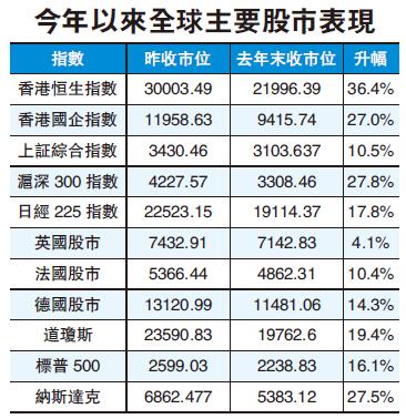 華大證券首席宏觀經濟學家楊玉川則指,港股今年於全球主要股市升幅排名第一。港股今年升勢比較明顯的特點是,龍頭股、科網股、金融股、地產股等大市值股票領漲;其次是成交量溫和上升,走勢穩定,市場基本沒有暴漲暴跌。