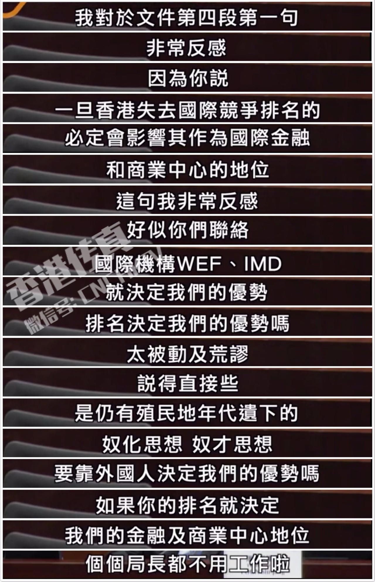 换而言之,特区政府的文件表达的思想是,如果香港在国外评级机构的排名中掉了下来,那香港地位就没了。