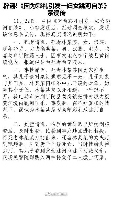 22日下午,宁陵县宣传部发通报回应此事,称网传说法不实。通报称,死者林某某因为其儿子谈对象订媒意见不一致,儿子对象与其同乡,林某某因相不中儿子谈的对象,嫌弃其个子低,林某某便以死相逼,一时想不开,骑电动车来到宁陵县黄岗镇张桥村境内废黄河境内跳河自杀。事发后,在不知真相的情况下,误认为林某某是因为高额彩礼致跳河自杀。