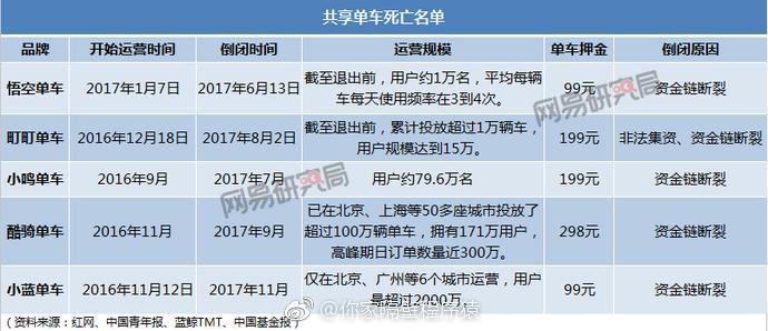 網易研究局根據公開資料整理出了一份死亡名單,5家品牌上榜,按照死亡時間依次為悟空單車、小鳴單車、町町單車、酷騎單車與小藍單車。其中,小藍單車用戶數量超過2000萬,酷騎單車高峰時期日訂單超過300萬。