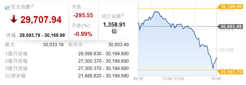 港股連續兩日衝高,相隔十年衝破三萬點關口,市場情緒熱烈。然而好景不常,港股今日先升後急回,今早輕微高開後,最多升逾一百六十點,然恒生指數未突破昨日的高位,午後受內地股市急跌拖累,恒指一度倒跌逾四百點,低見29593點,收市報29707點,跌295點。大市成交較前兩日少一成三,報1358.91億元。國企指數報11737點,跌221點。
